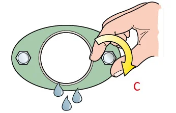Der Verpressdruck der Brille sollte gleichmäßig zwischen den Brillenbolzen aufgebracht werden und sicherstellen, dass die Ringe sich gesetzt haben sowie vollständig am Stopfbuchsgrund aufliegen und dort dichten. (Schritt A)