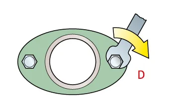 Der Verpressdruck der Brille sollte gleichmäßig zwischen den Brillenbolzen aufgebracht werden und sicherstellen, dass die Ringe sich gesetzt haben sowie vollständig am Stopfbuchsgrund aufliegen und dort dichten. (Schritt A)