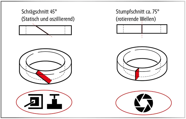 Ein Stumpfschnitt ist empfohlen. Sollte ein Schrägschnitt gewünscht werden, empfehlen wir die Ringe in einer Form, entsprechend den Abmessungen der Stopfbuchse in der die Ringe installiert werden müssen, vorzupressen.