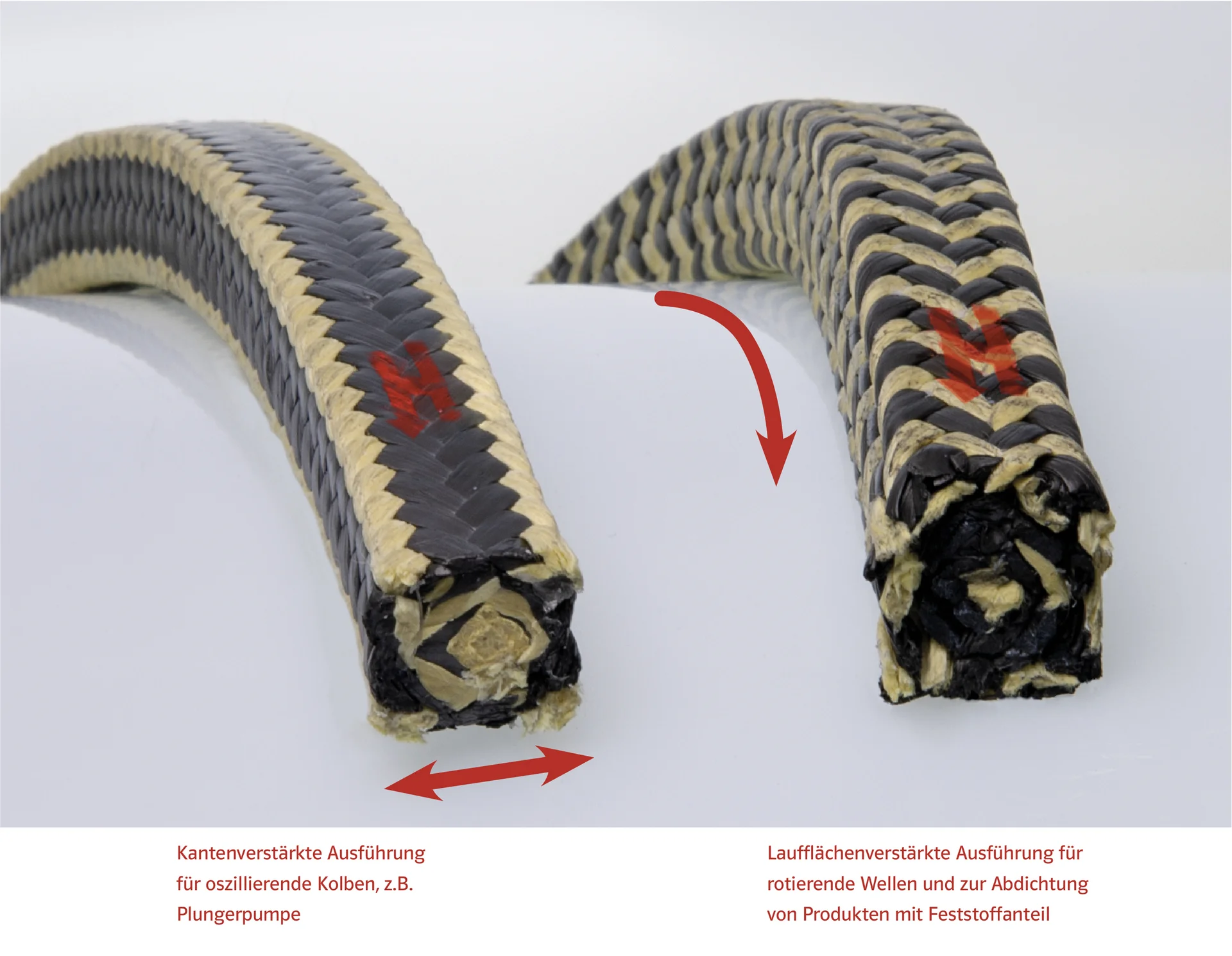 Laufflächen verstärkte Kombinationspackung mit erweitertem pH-Bereich; Bessere Wärmeableitung und mechanisch höhere Festigkeit der Packung infolge spezieller Kombiflechtung; Gleichmäßiges, reduziertes Verschleißbild auf der Welle; Oberflächenhärte HRC 35 ist ausreichend
